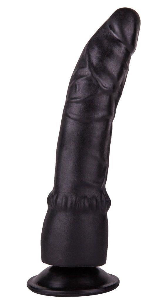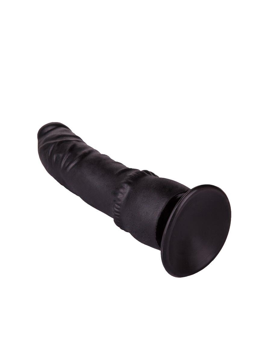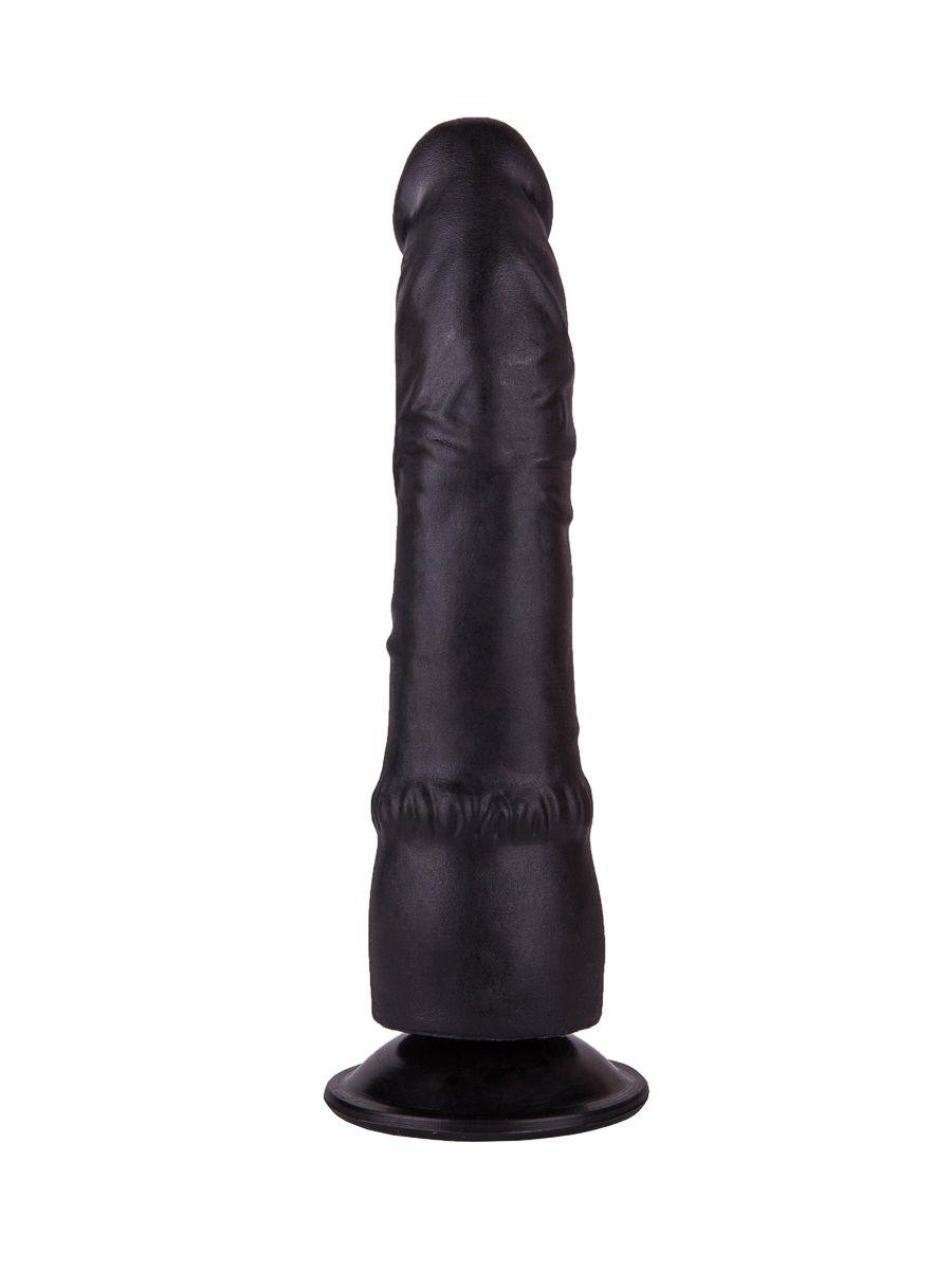 Чёрный фаллоимитатор с подошвой-присоской и широкой бороздкой на расширяющемся книзу основании идеален как для вагинальных ласк, так и для анальных проникновений.