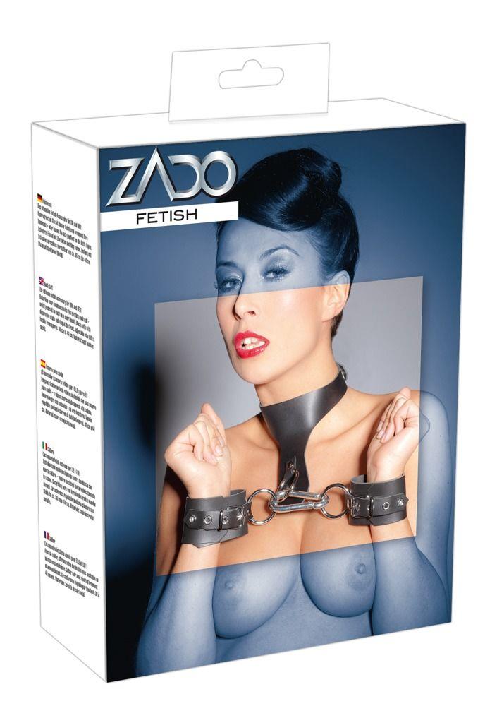Кожаный воротник с кольцом и двумя широкими кожаными ремнями на запястья, все скреплено прочным карабином. Все ремни регулируемые.