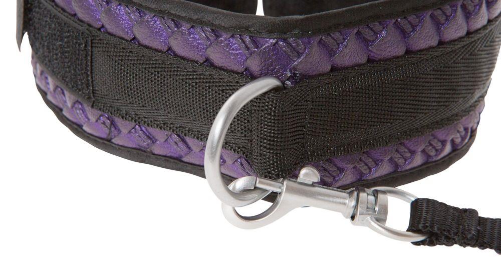 Чёрно-фиолетовый набор для бондажа Bondage Set включает в себя плеть, ошейник с поводком и наручники.