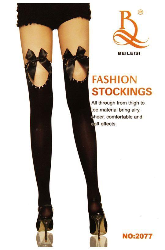 Чулки из плотного нейлона тоже могут выглядеть оригинально и необычно. Данная модель это полностью подтверждает. Игривые вырезы сзади, украшенные сияющими стразами, и кокетливые бантики демонстрируют особый вкус владелицы чулок. Она явно вознамерилась сегодня кого-то соблазнить, и нет никакой причины, чтобы ей это не удалось.