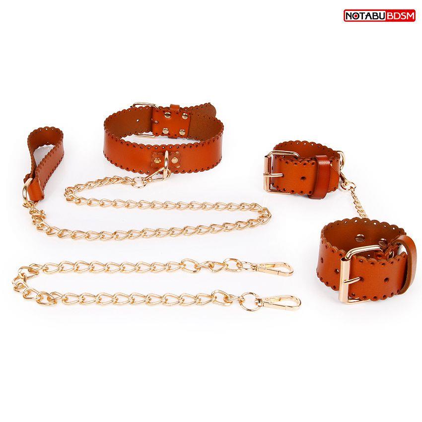 Великолепный набор аксессуаров для любителей БДСМ. В комплект входят наручники и ошейник с цепочкой-поводком. Изделия имеют возможность регулировки размера, изготовлены из кожи.