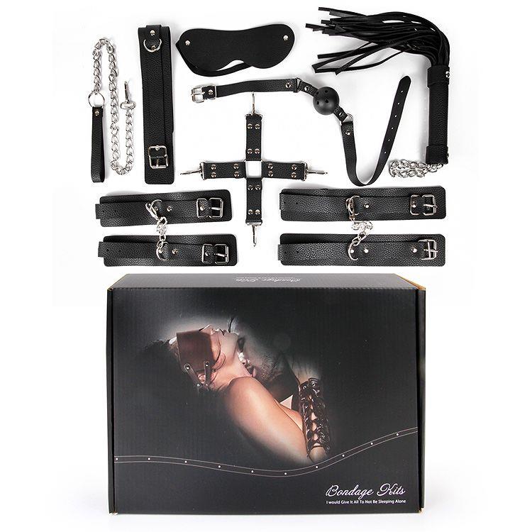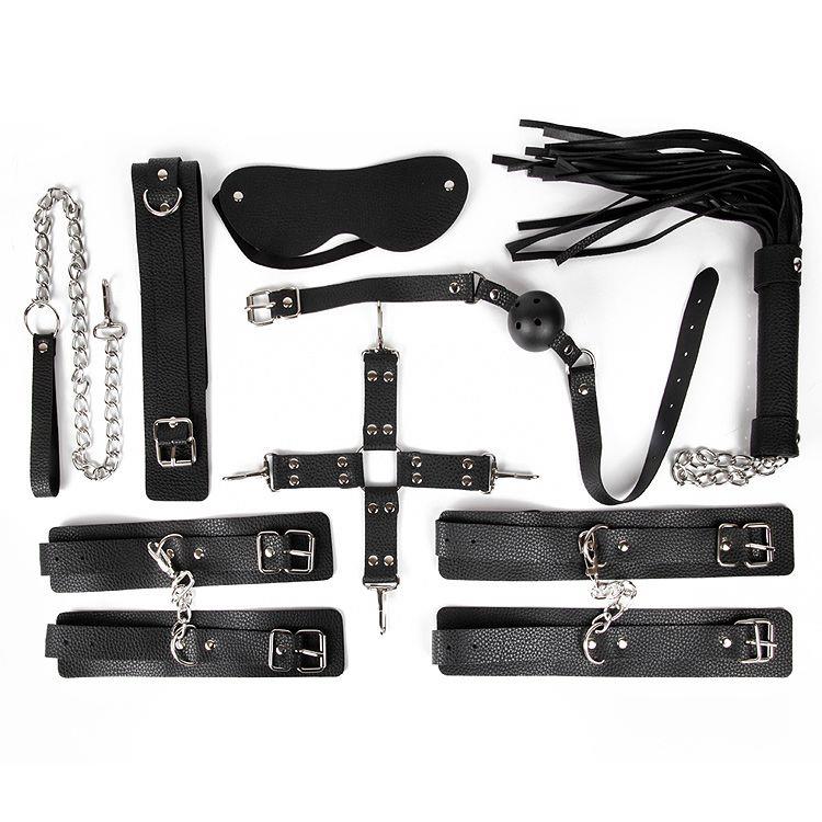 Великолепный черный набор аксессуаров для любителей БДСМ. В комплект входят наручники, оковы, ошейник с цепочкой-поводком, фиксатор, плеть, кляп, маска.