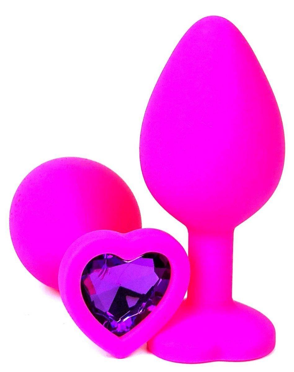 Силиконовая анальная пробка розового цвета с красочным фиолетовым стразом-сердечком внесет разнообразие в вашу интимную жизнь.
