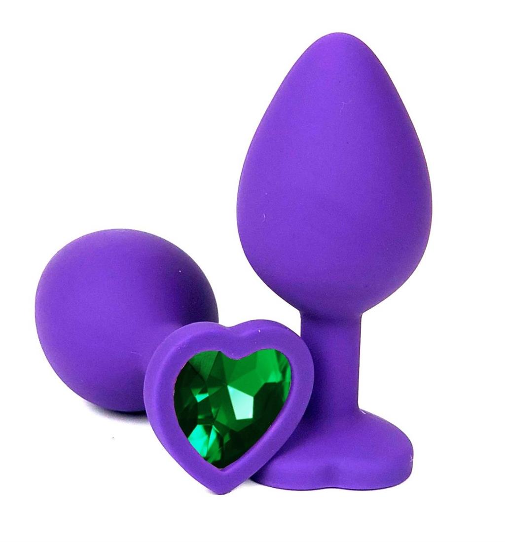 Фиолетовая анальная пробка из силикона с красочным зеленым стразом в виде сердечка внесет разнообразие в вашу интимную жизнь.