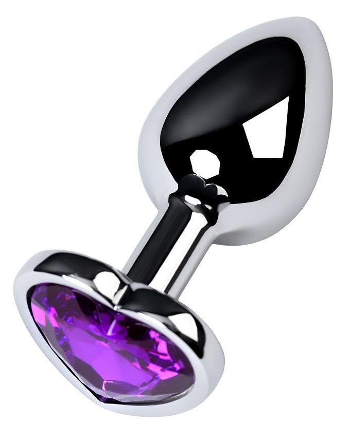Серебристая коническая анальная пробка с фиолетовым кристаллом-сердечком - 7 см.