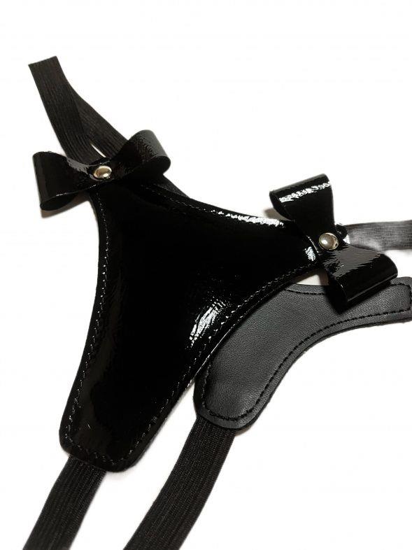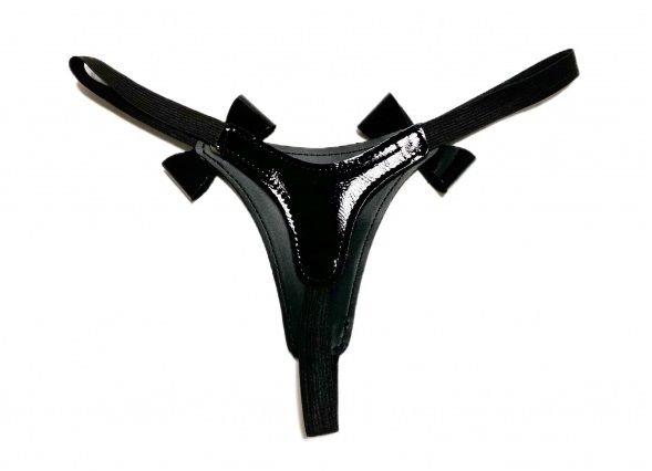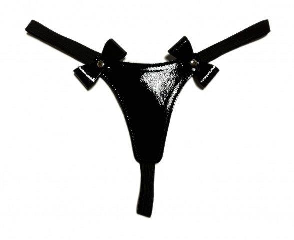Сексуальные черные стринги, выполненные из эко-кожи. Декорированы спереди двумя бантиками.