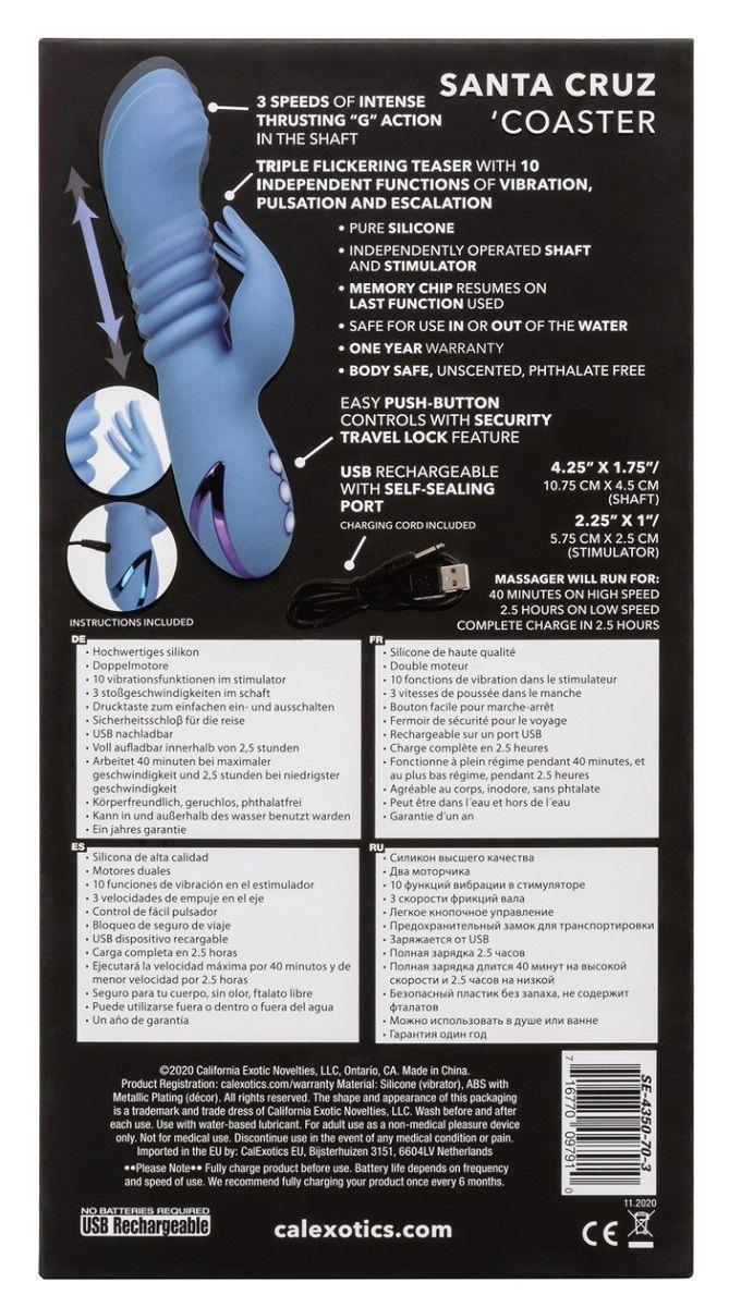 Голубой вибромассажер Santa Cruz Coaster – перезаряжаемый мультискоростной вибратор кролик из бесшовного материала с дополнительной обработкой. Вагинальный отросток у этой модели имеет изогнутую форму и 3 функции интенсивное поступательное воздействие. Клиторальный отросток с тремя лепестками на кончике имеет отдельный мощный виброэлемент, обеспечивающий 10 режимов интенсивной вибрации.