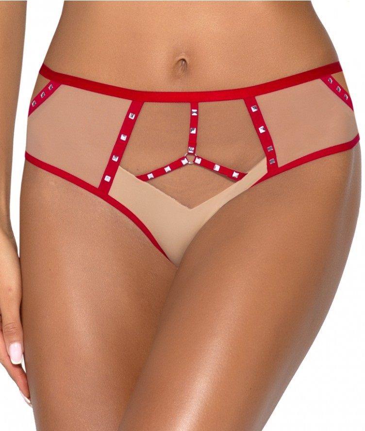 Трусики-слип Gillian из бежевой сетки и гладкой ткани. Резинки тонкие, контрастного красного цвета.