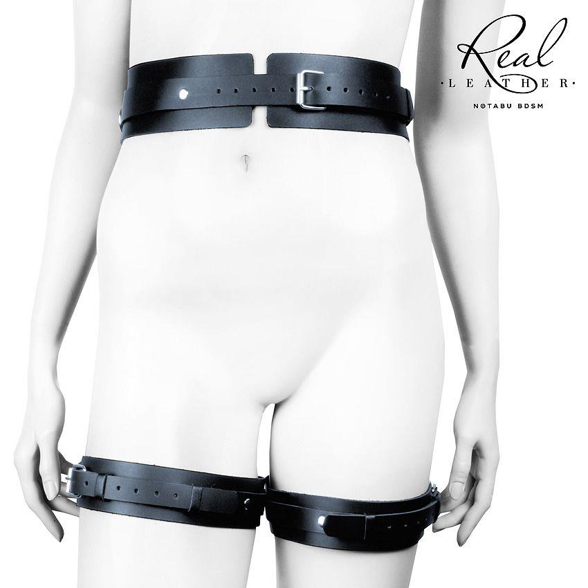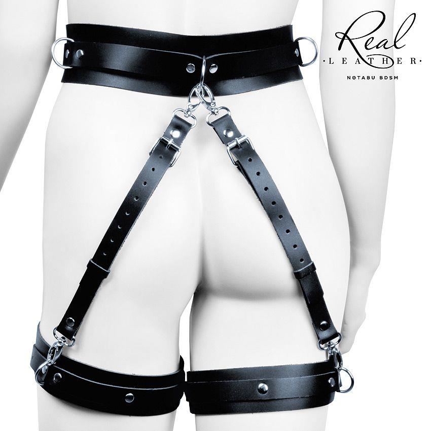 Широкий ремень-пояс фиксируется на талии, более узкие ремни-оковы – на бёдрах. Металлические застёжки регулируют размеры изделия, усиливают или ослабляют натяжение. Пояс и оковы соединяются между собой ремешками с карабинами, что позволяет менять положение гартеров на теле или отсоединять их друг от друга.