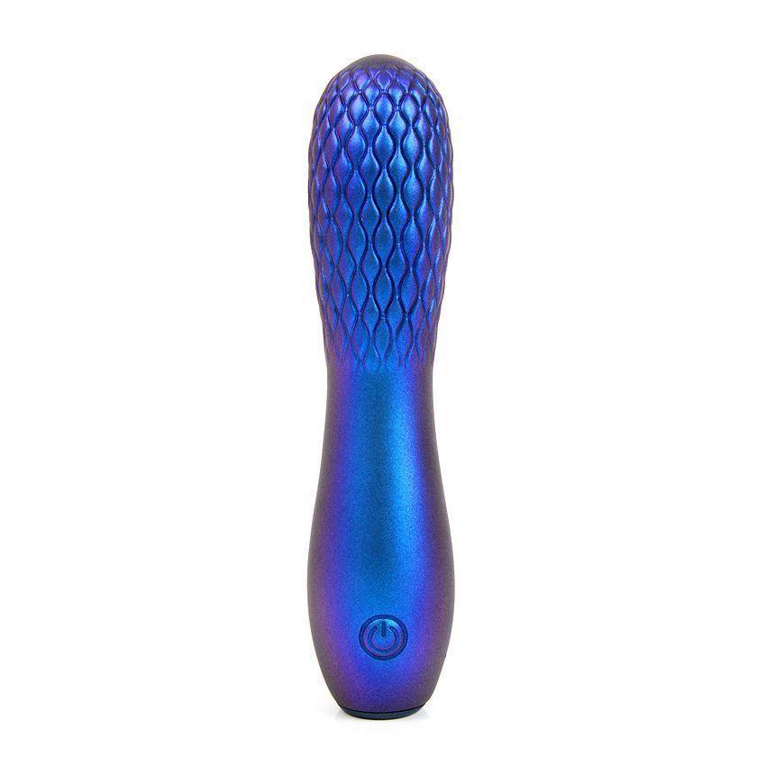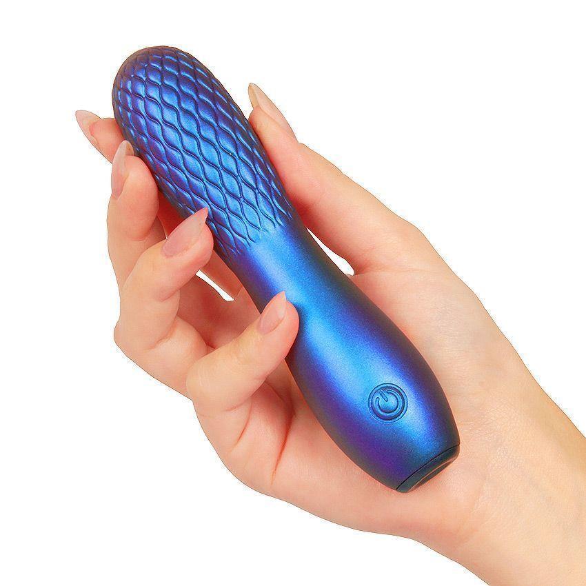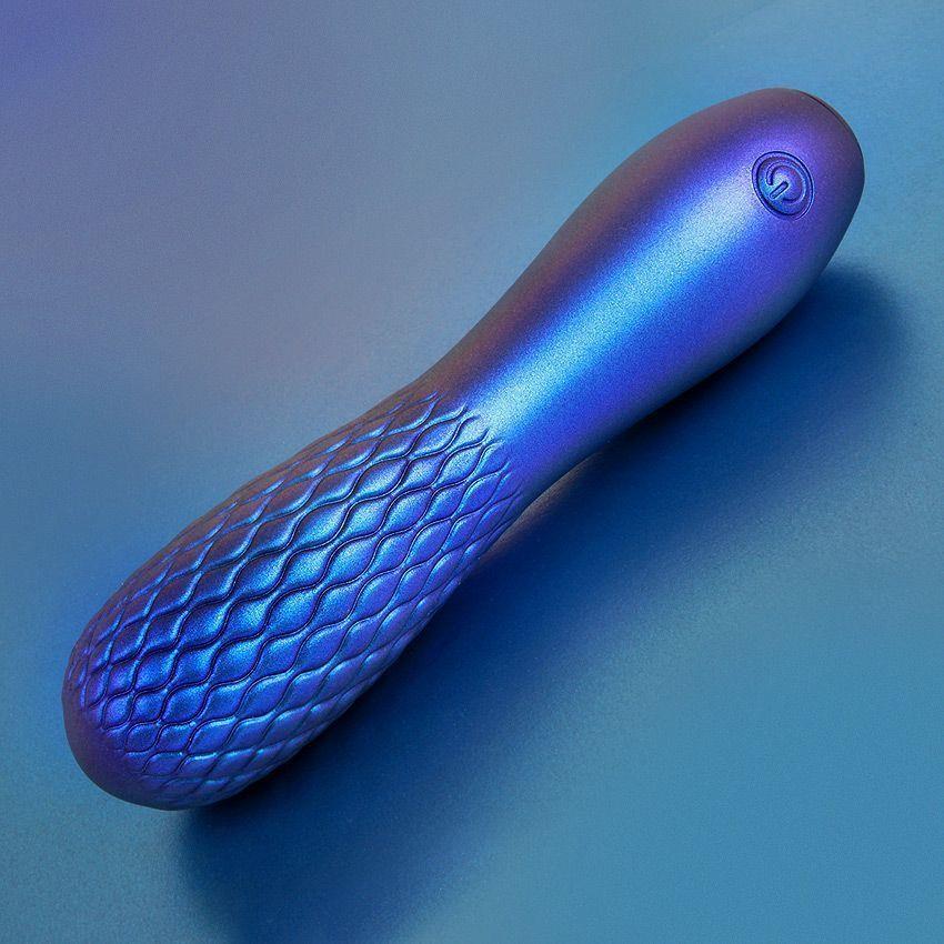 Синий вибромассажер с рельефной головкой имеет 10 режимов вибрации.