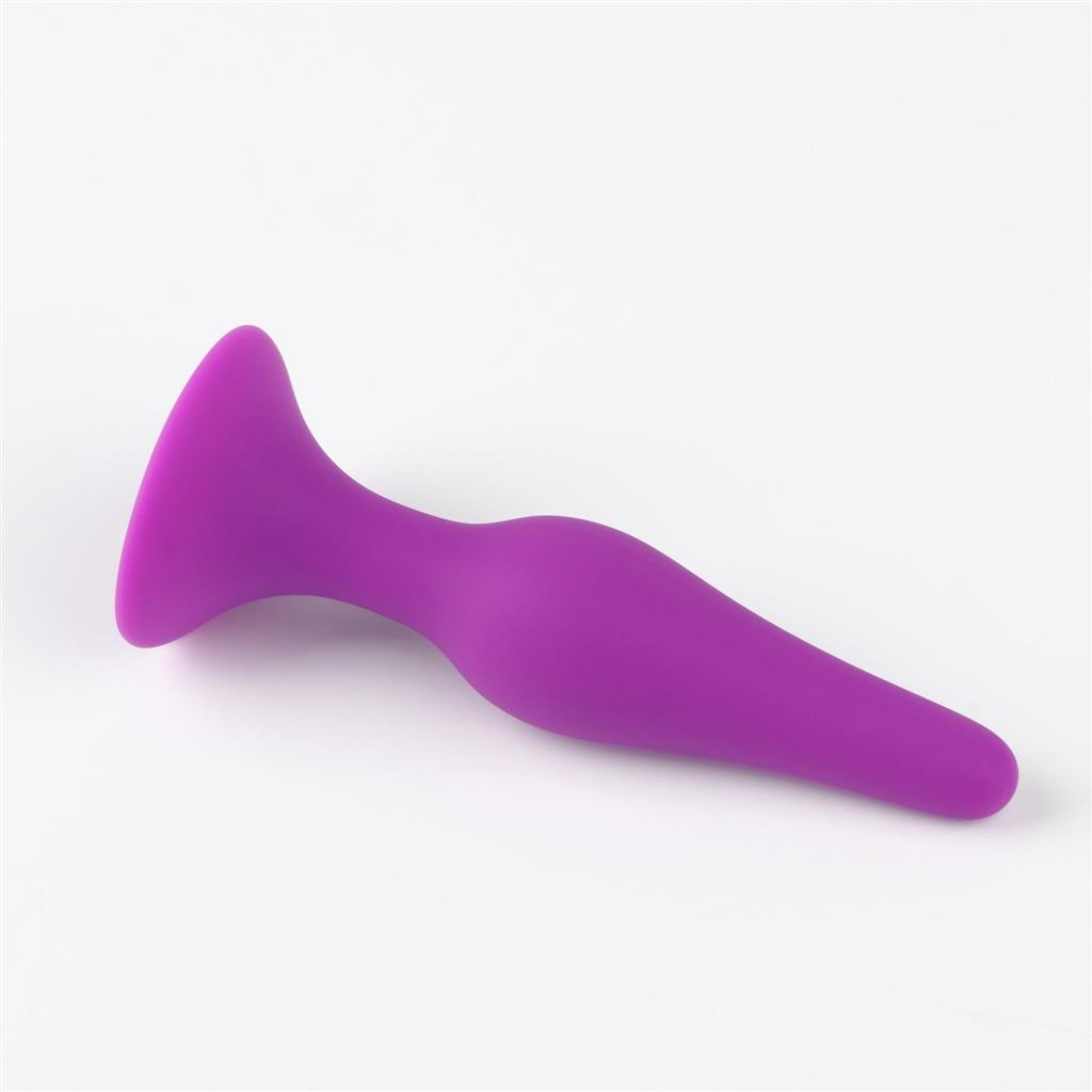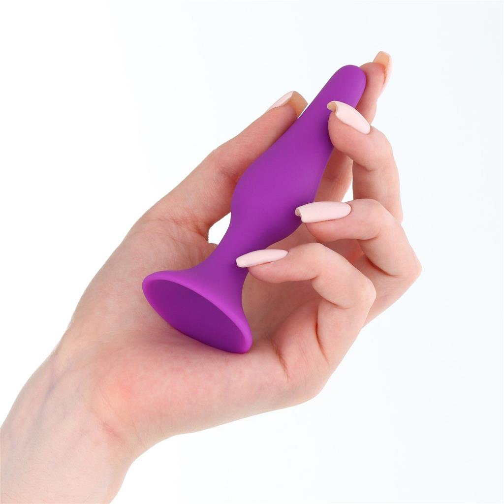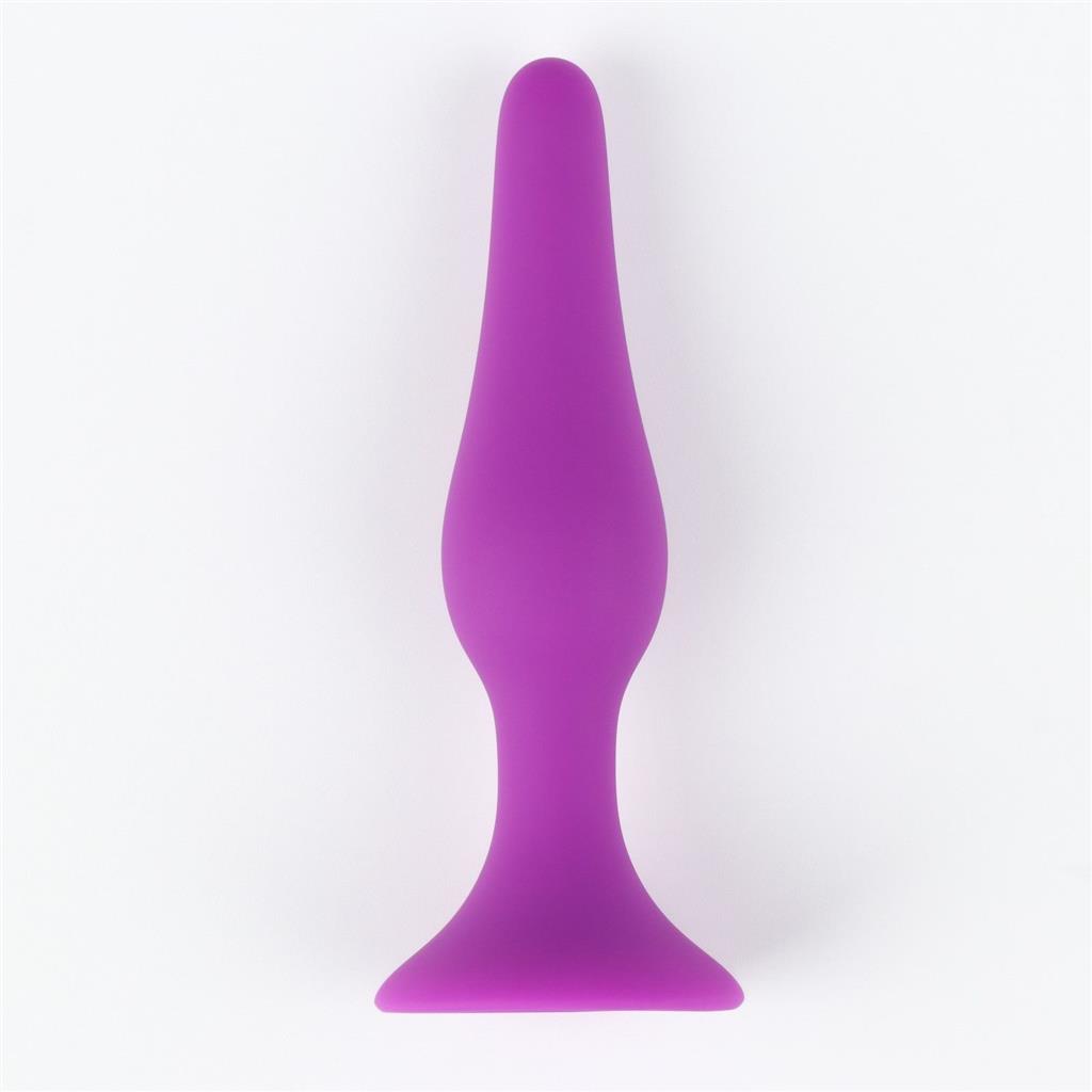 Классическая удлиненная анальная пробка фиолетового цвета с ограничительным основанием.