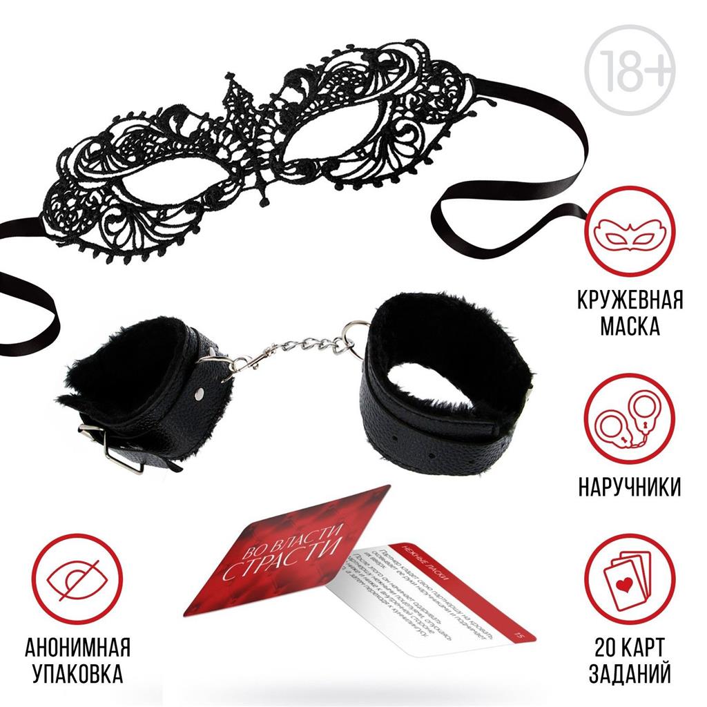 Пикантный секрет для вашего удовольствия. Этот набор позволит вам разнообразить сексуальную жизнь и добавить в неё немного перчинки. Вас ждут 20 карт с возбуждающими заданиями из серии «Во власти страсти», кожаные наручники и кружевная маска.