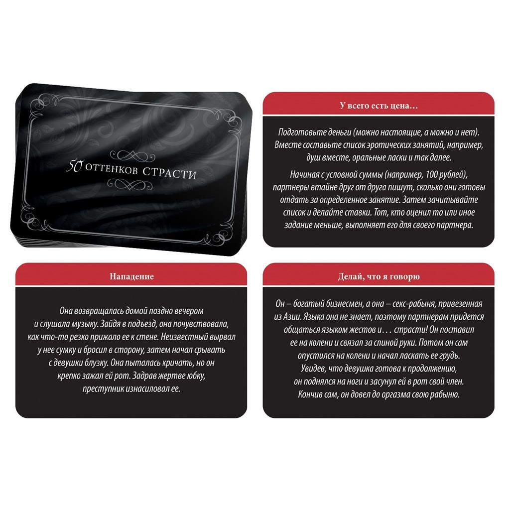 Внутри вас ждут карточки с ролевыми играми и эротическими заданиями из серии «50 оттенков страсти». По очереди вытягивайте карточки, зачитывайте задания и выполняйте их. Помните, что все задания направлены на то, чтобы доставить удовольствие вам и вашему партнёру.