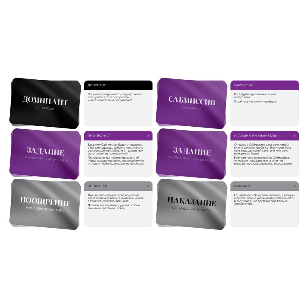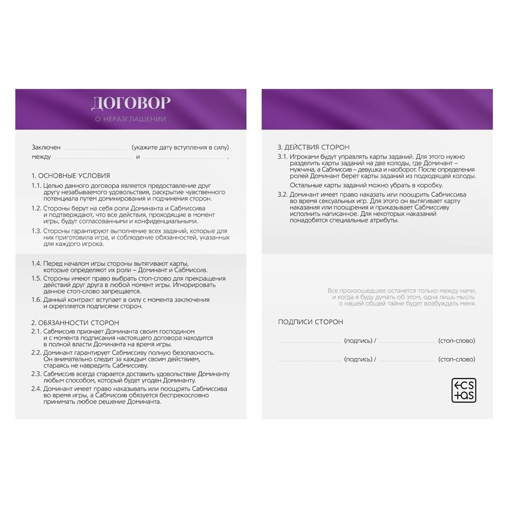 Как пользоваться набором? Внутри вы найдёте карты с разными локациями и эротическими идеями, благодаря которым посещение привычных мест в городе уже не будет прежним. Подпишите договор о неразглашении и выберите желаемую роль. Один из вас будет доминирующим (доминантом), а другой - подчиняющимся (сабмиссивом). Выбирайте карты заданий и следуйте инструкциям. Доминирующий может наградить подчиняющегося за покорность, используя карту «Поощрение», либо наказать за непокорность, используя карту «Наказание».