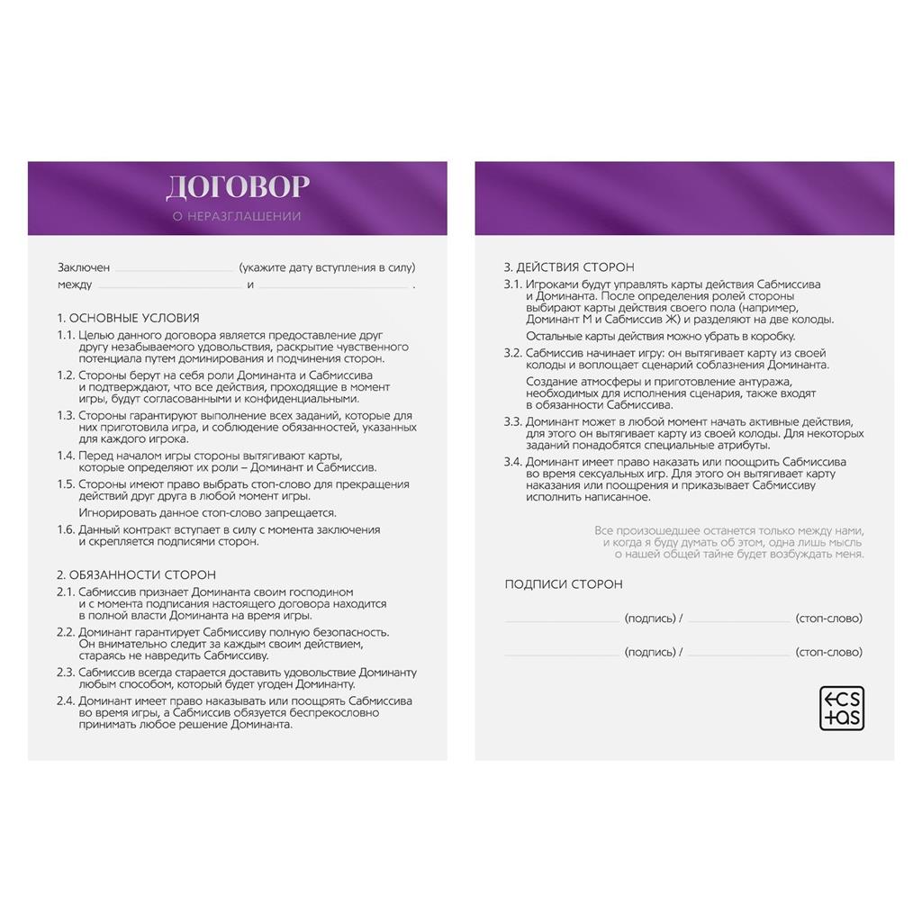 Подпишите договор о неразглашении и выберите желаемую роль. Один из вас будет доминирующим (доминантом), а другой - подчиняющимся (сабмиссивом). В комплекте есть карты действия для обоих партнёров. На них вас ждут возбуждающие задания с элементами БДСМ. По очереди вытягивайте карточки, предназначенные для вашей роли, и выполняйте задания.