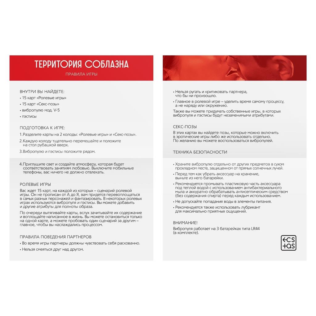 Осторожно! Вы вступили на территорию соблазна. «Территория соблазна» – это серия эротических игр для двоих, в основе которой лежит акцент на раскрепощения. Разговоры, лёгкие прикосновения, пикантные фанты, прелюдия к сексу и постепенный переход к самому главному – сексу. Серия включает в себя наборы с аксессуарами, карточные игры, наборы кубиков и т.д.