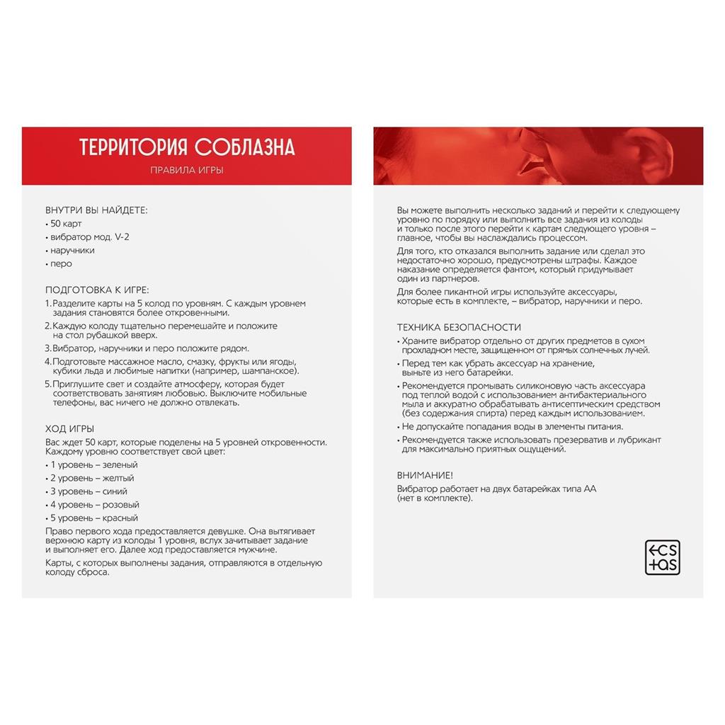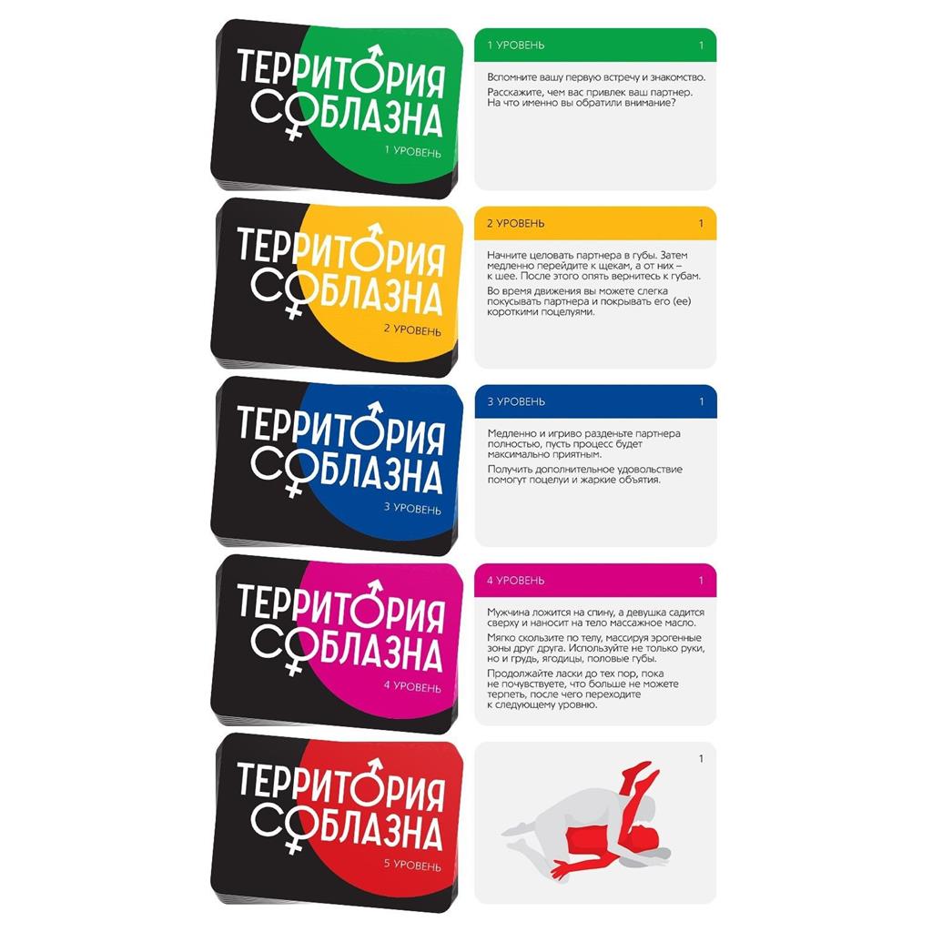 Территория соблазна – это серия эротических игр для двоих, в основе которой лежит акцент на раскрепощения. Разговоры, лёгкие прикосновения, пикантные фанты, прелюдия к сексу и постепенный переход к самому главному – сексу. Серия включает в себя наборы с аксессуарами, карточные игры, наборы кубиков и т.д.