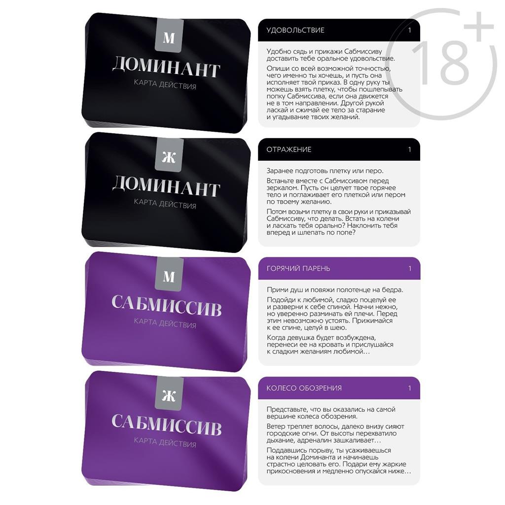 Пикантный секрет для вашего удовольствия. Этот набор позволит вам разнообразить сексуальную жизнь и добавить в неё немного перчинки. Вас ждут 20 карт из серии «50 оттенков страсти», которые включают в себя карты действия для обоих партнёров. Один из вас будет доминирующим, а другой - подчиняющимся.